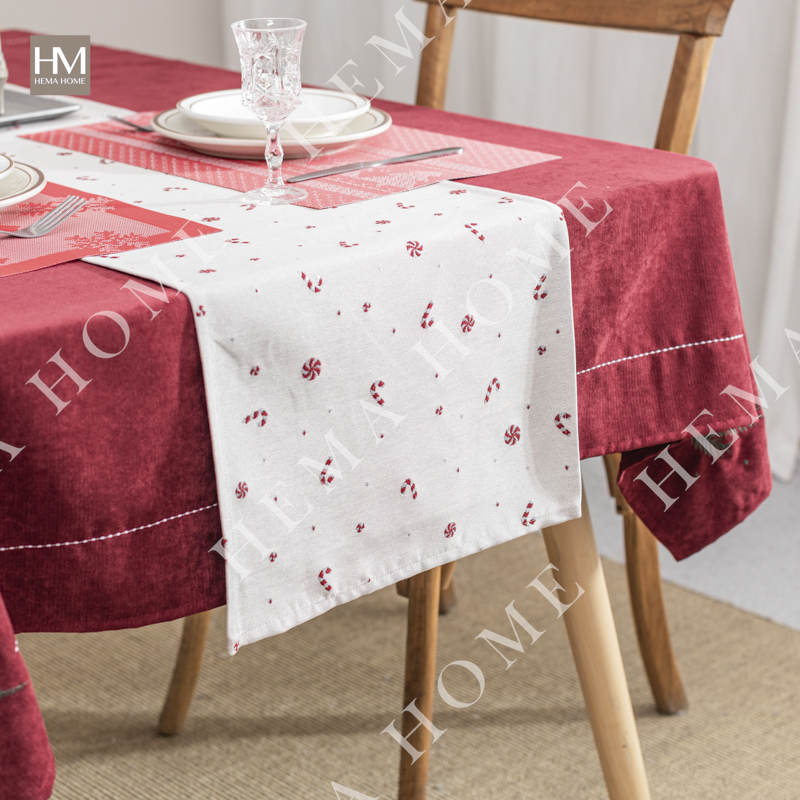 Embroidery Christmas Pattern Cotton Table Runner with Plaid Pattern Fabric Edge