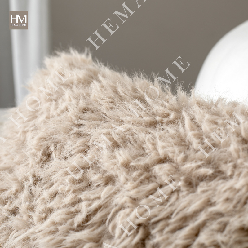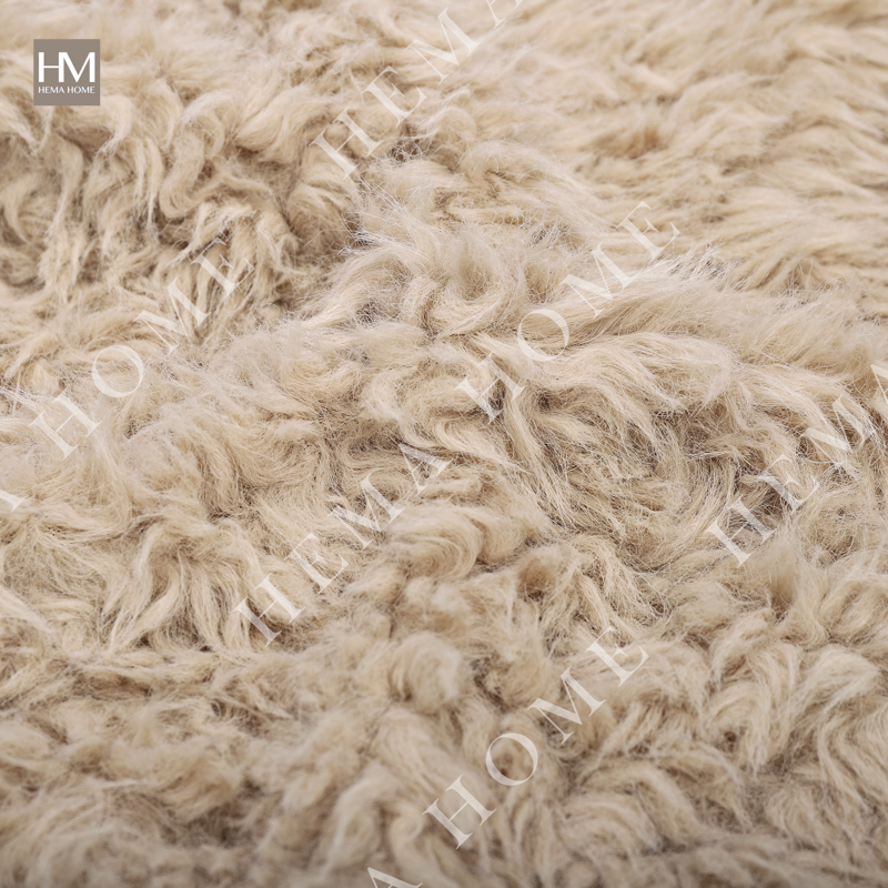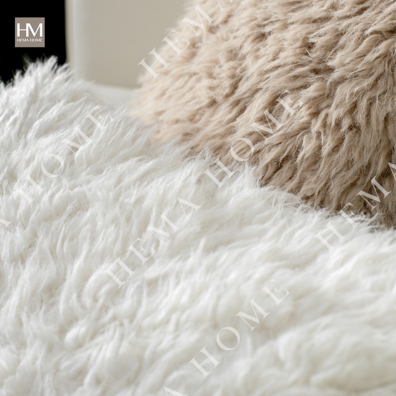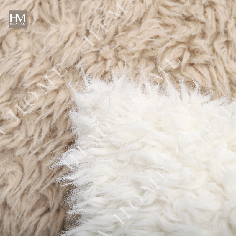 Front side is 570GSM wool faux fur fabric, back side is solid color velvet fabric.