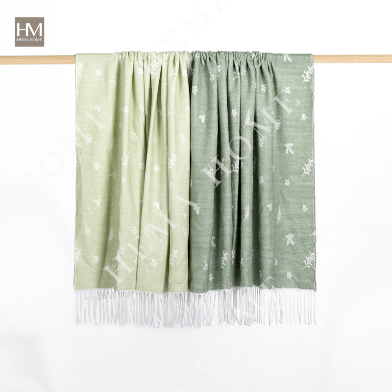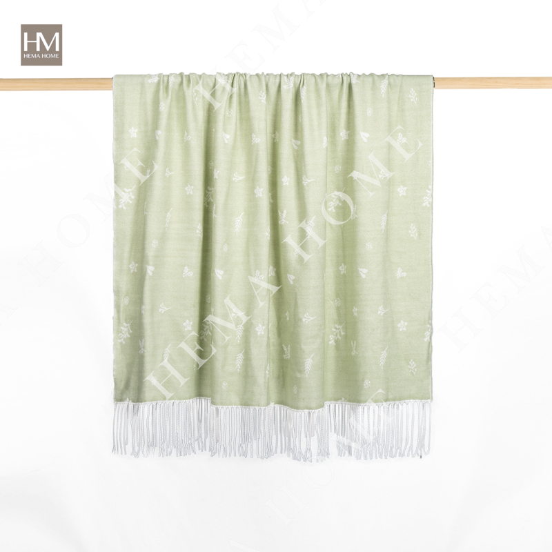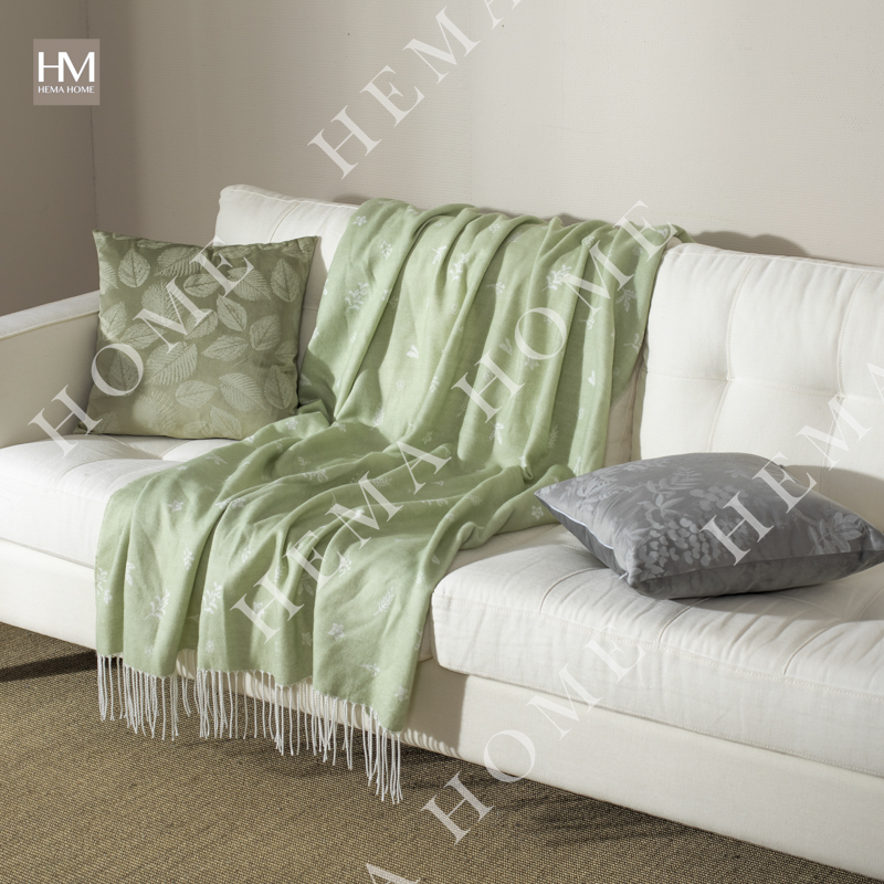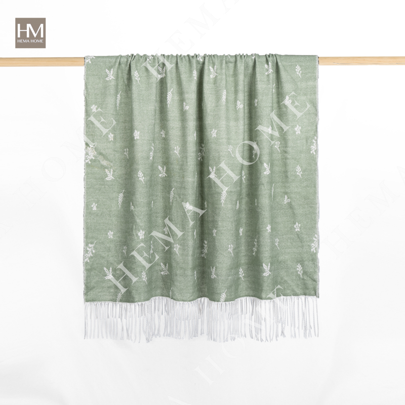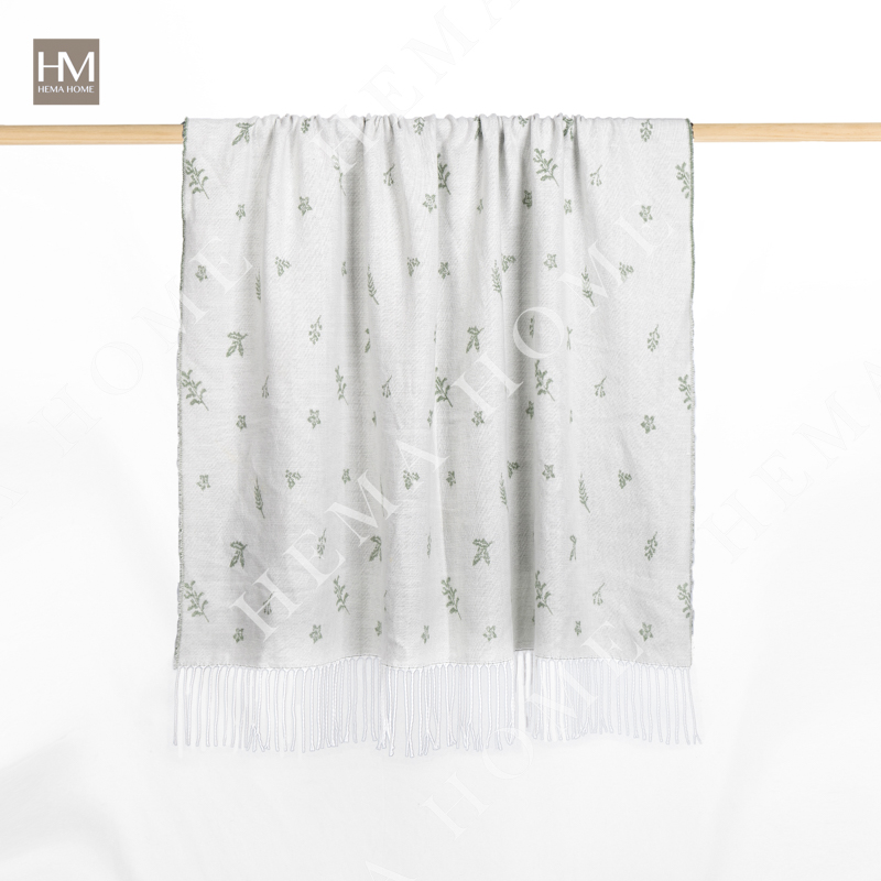 Jacquard Leaves Pattern Polyester Blanket with Fringes