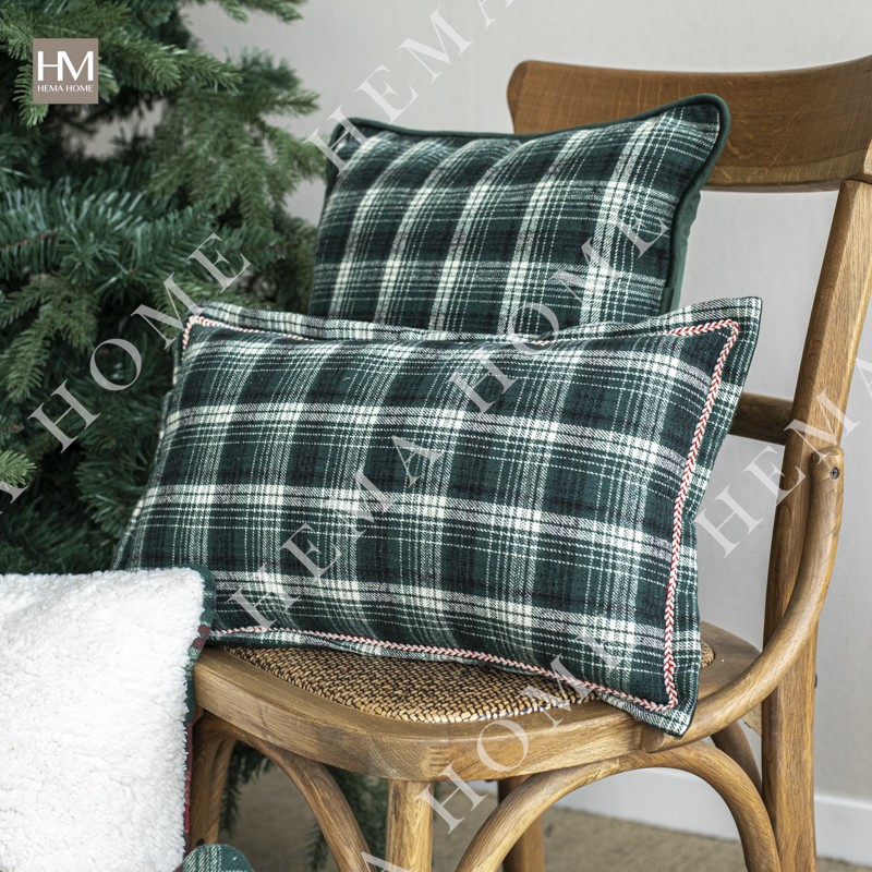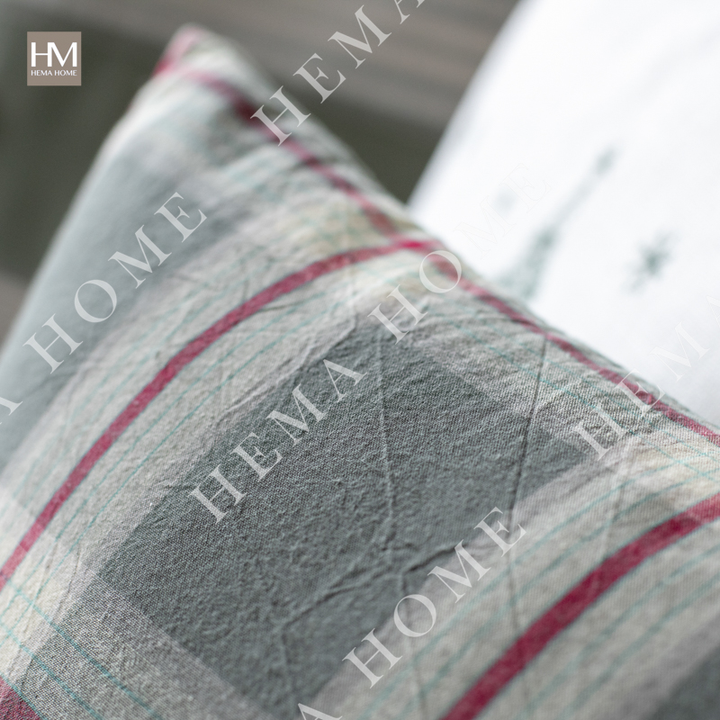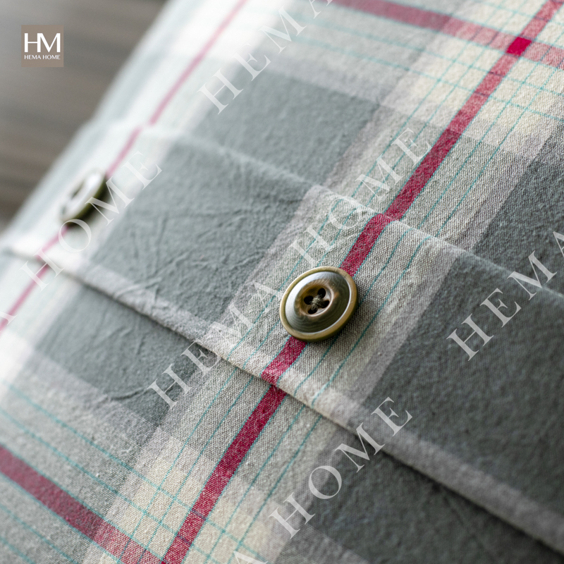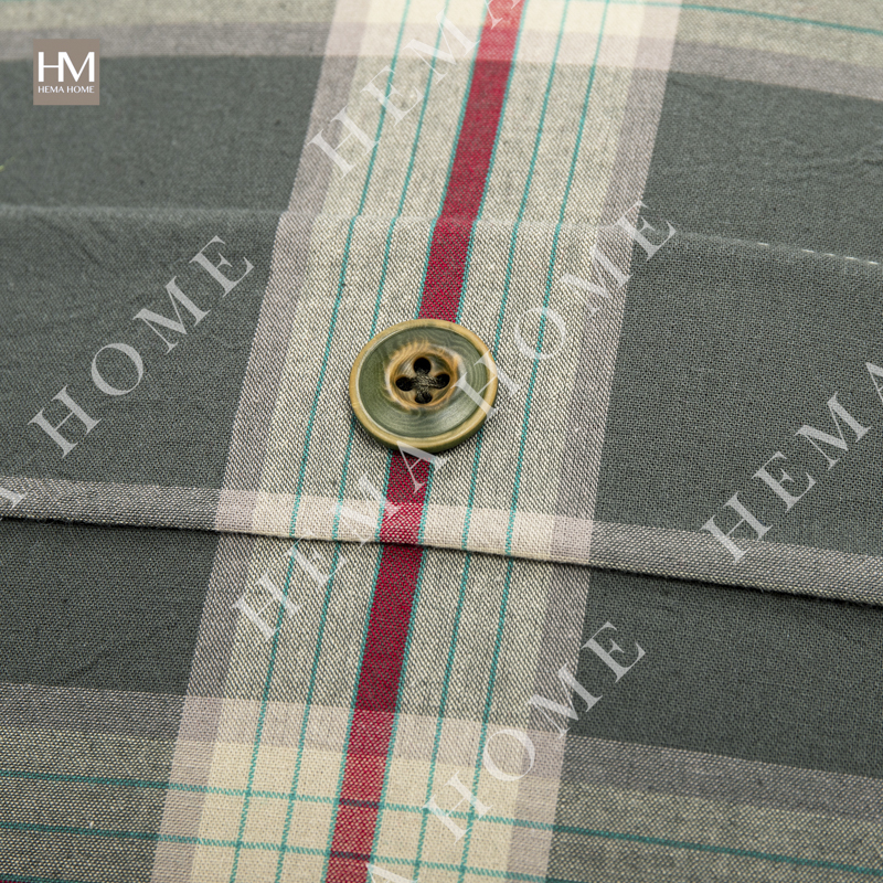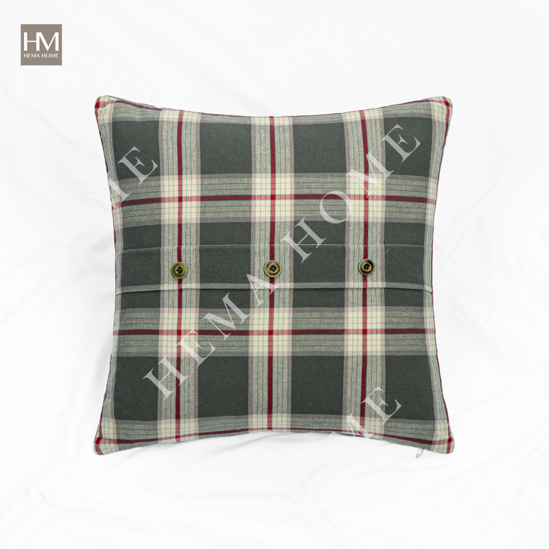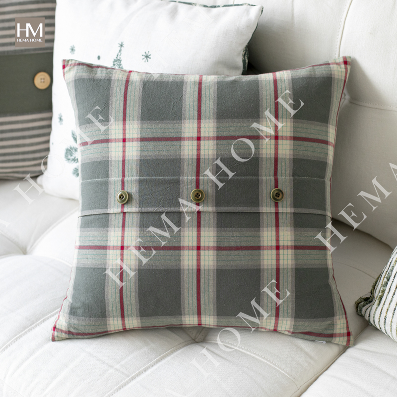 Checked Pattern Folded Seam Cotton Cushion with Buttons
