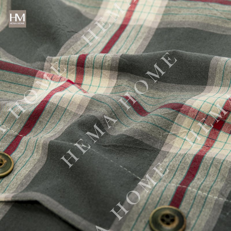Front side is checked pattern cotton fabric, back side is polyester blended fabric.