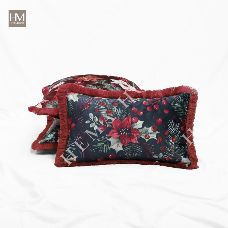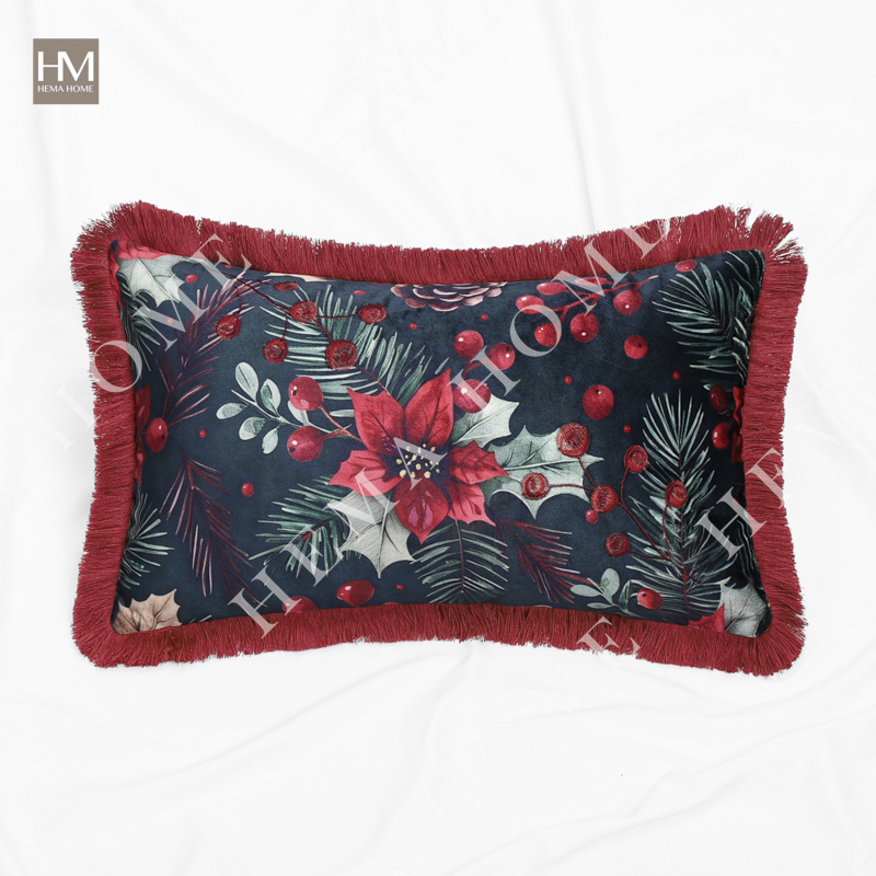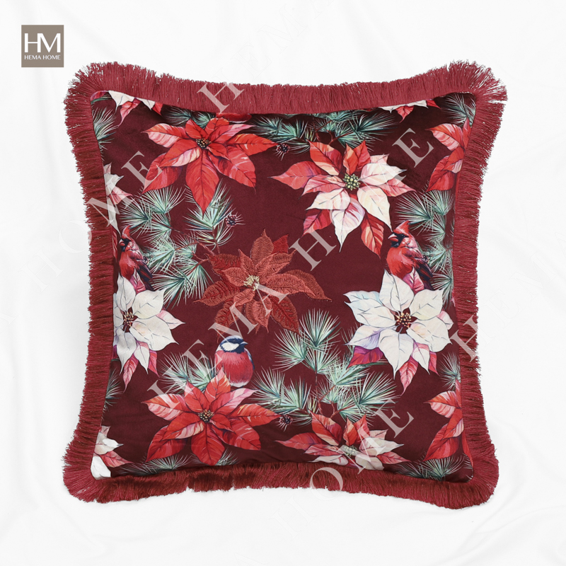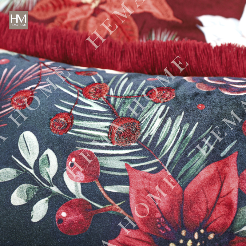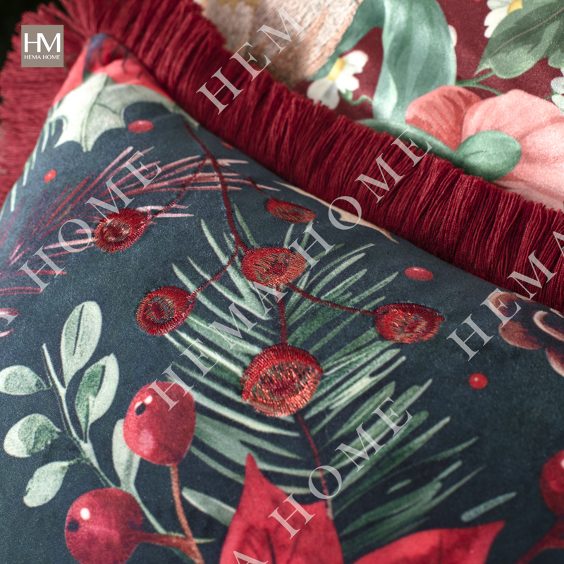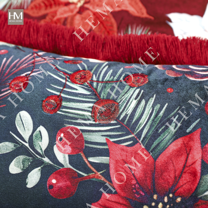 Digital Printed and Embroidered Xmas Flowers/Red Berries Patterns Velvet Fabric Cushion with Fringes