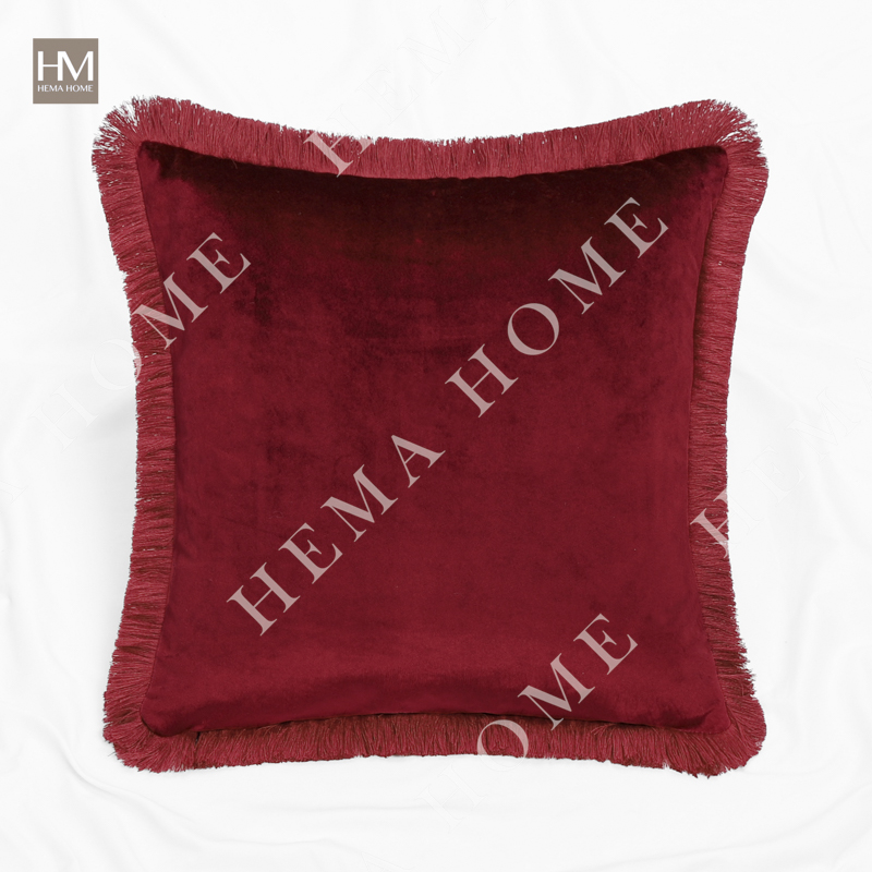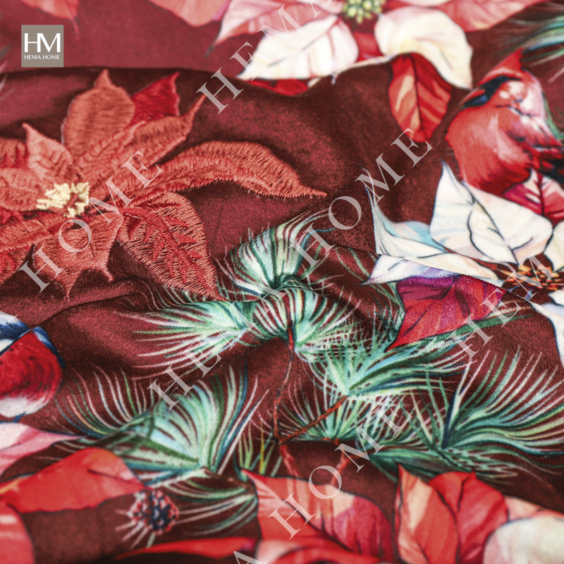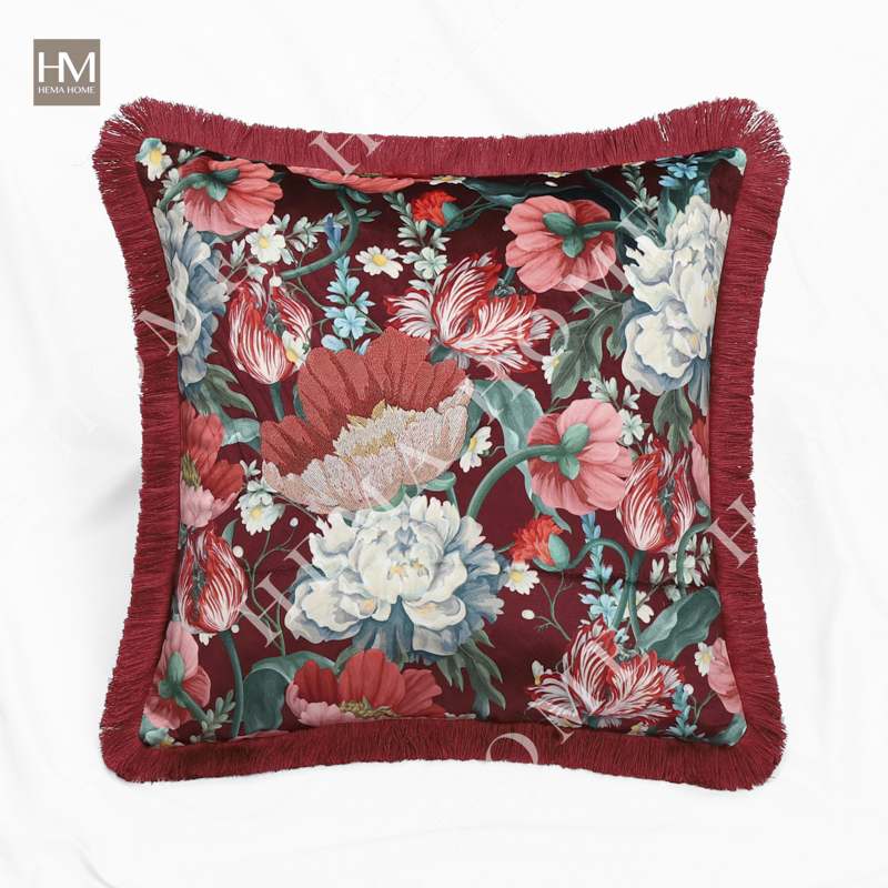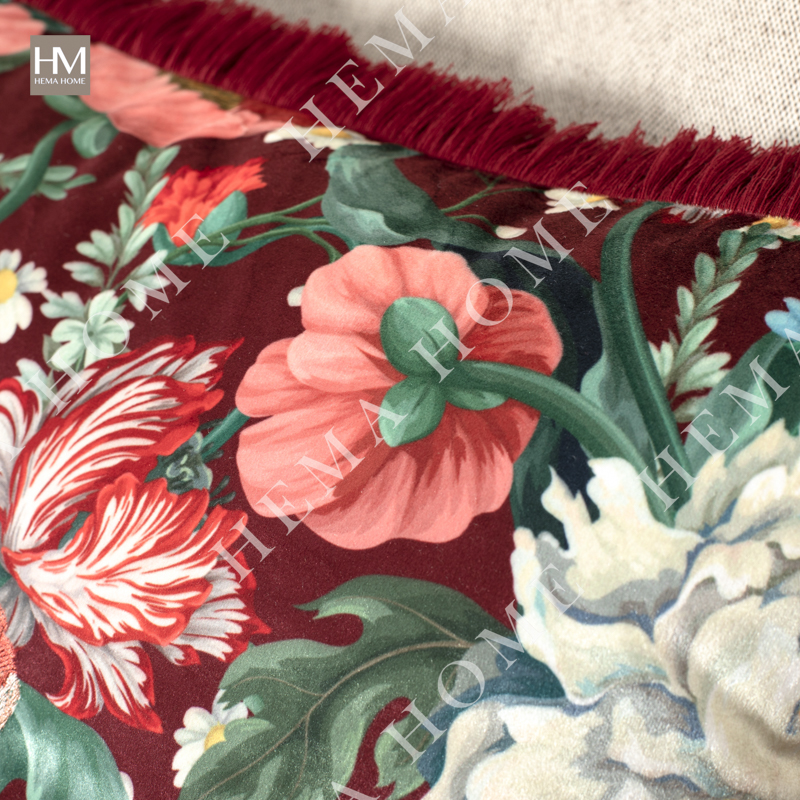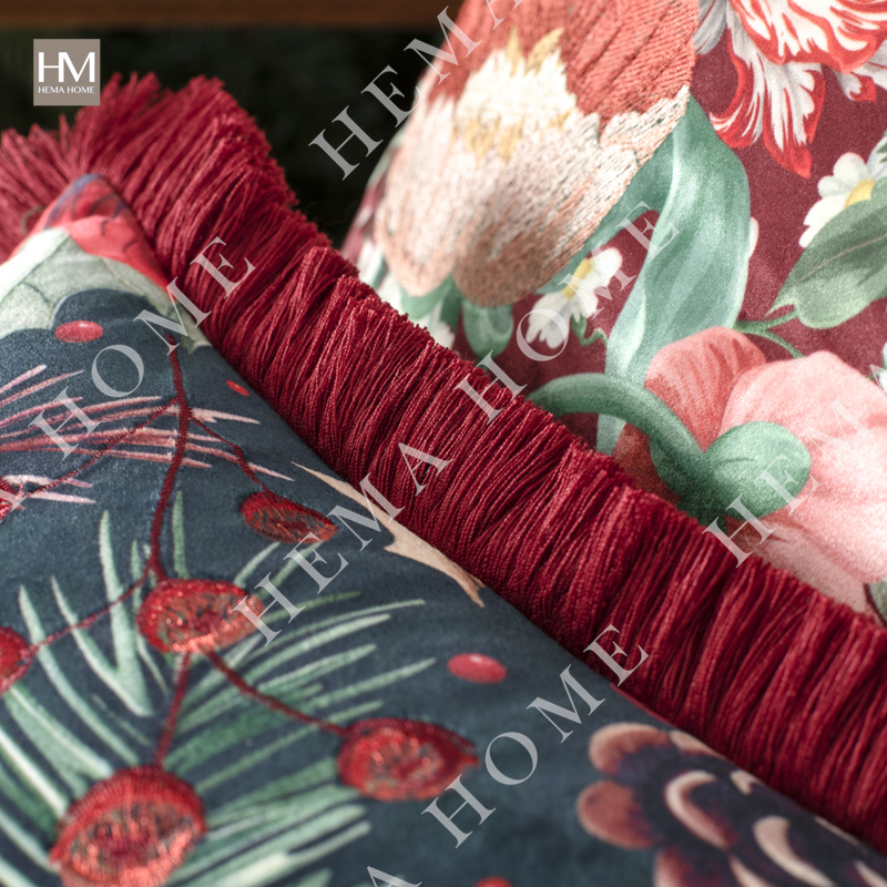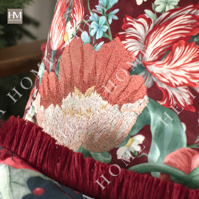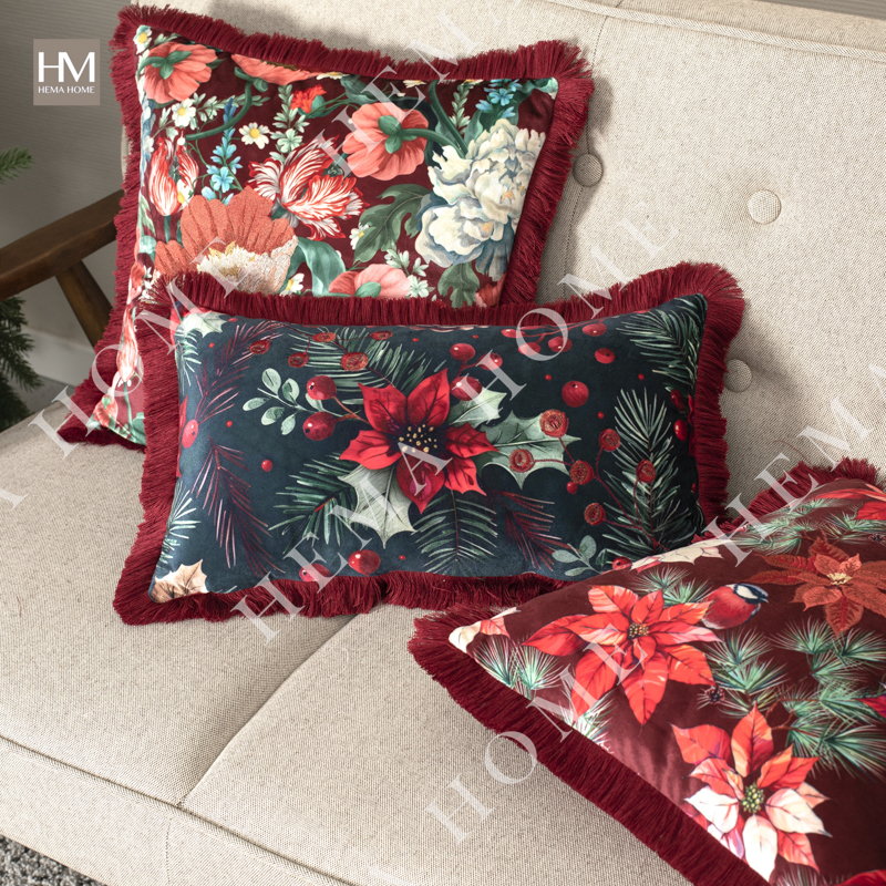 Digital Printed and Embroidered Xmas Flowers/Red Berries Patterns Velvet Fabric Cushion with Fringes
