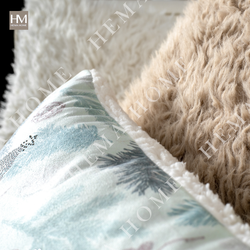 Front side is digital printing and rhinestone embellished velvet fabric, back side is sherpa fabric.