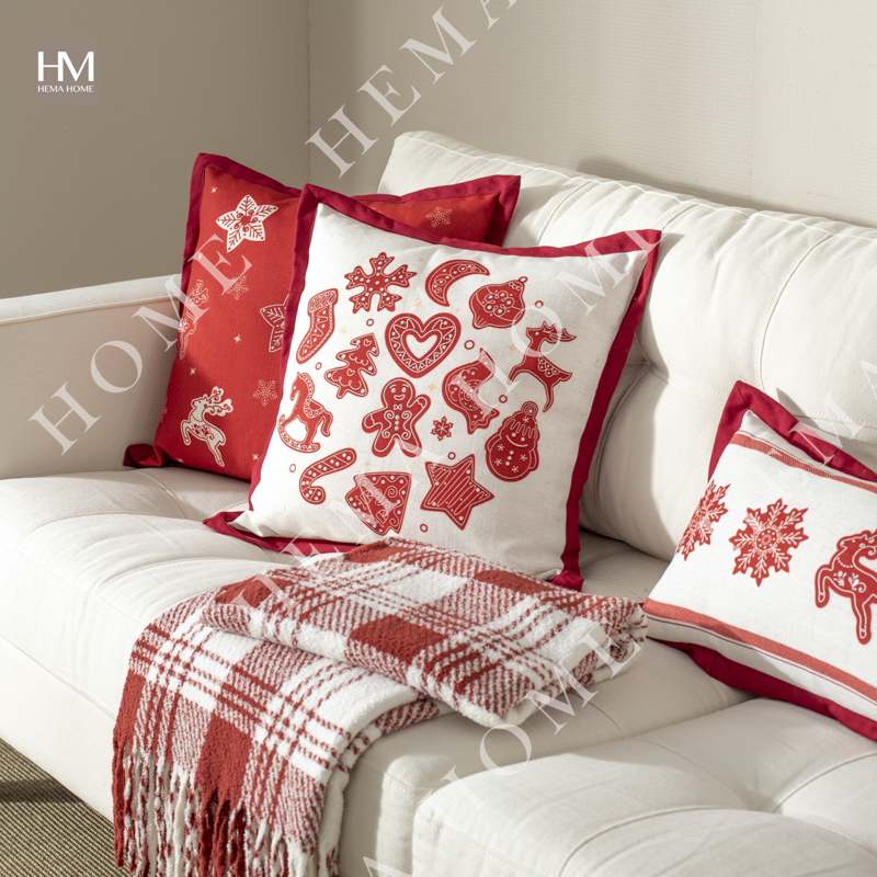 Embroidered and Printed Xmas Pattern Poly-Linen Cushion with Poly-Cotton Back