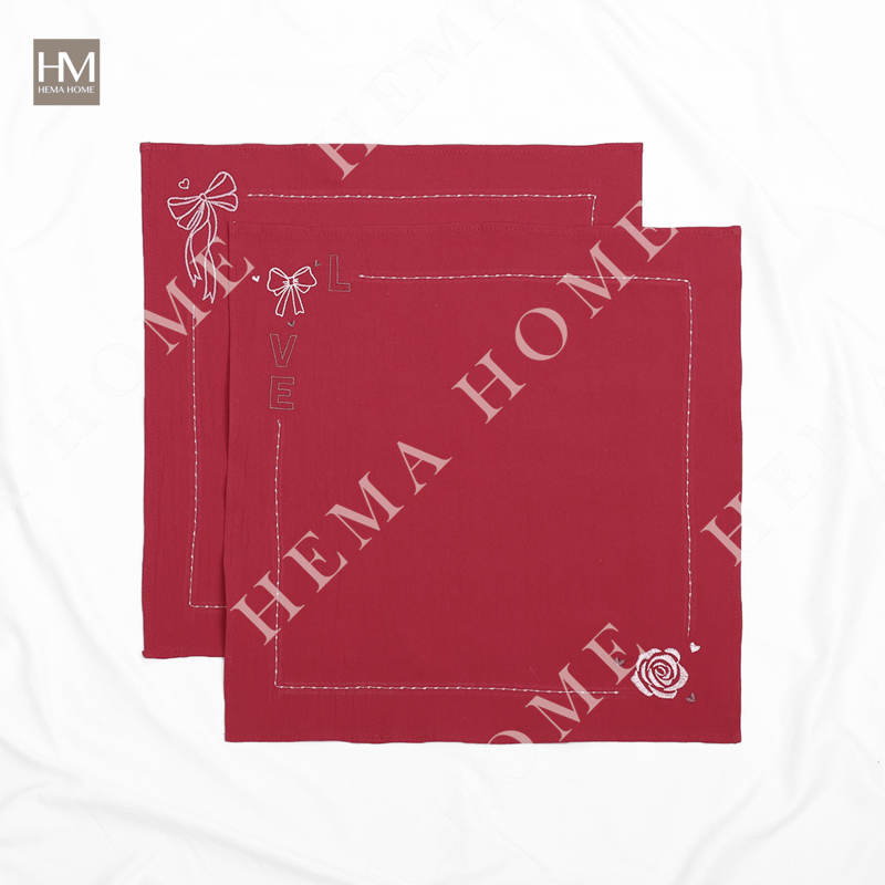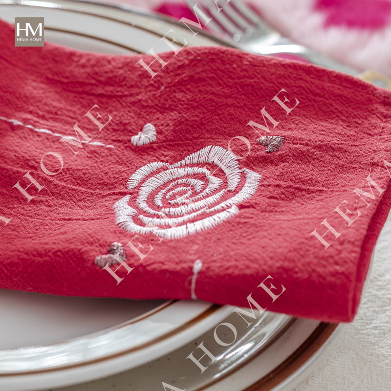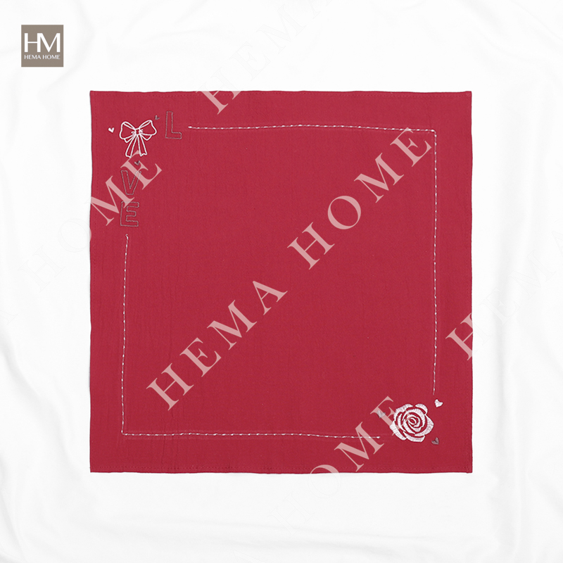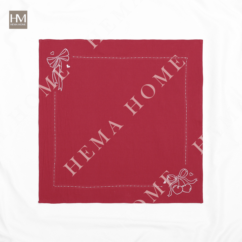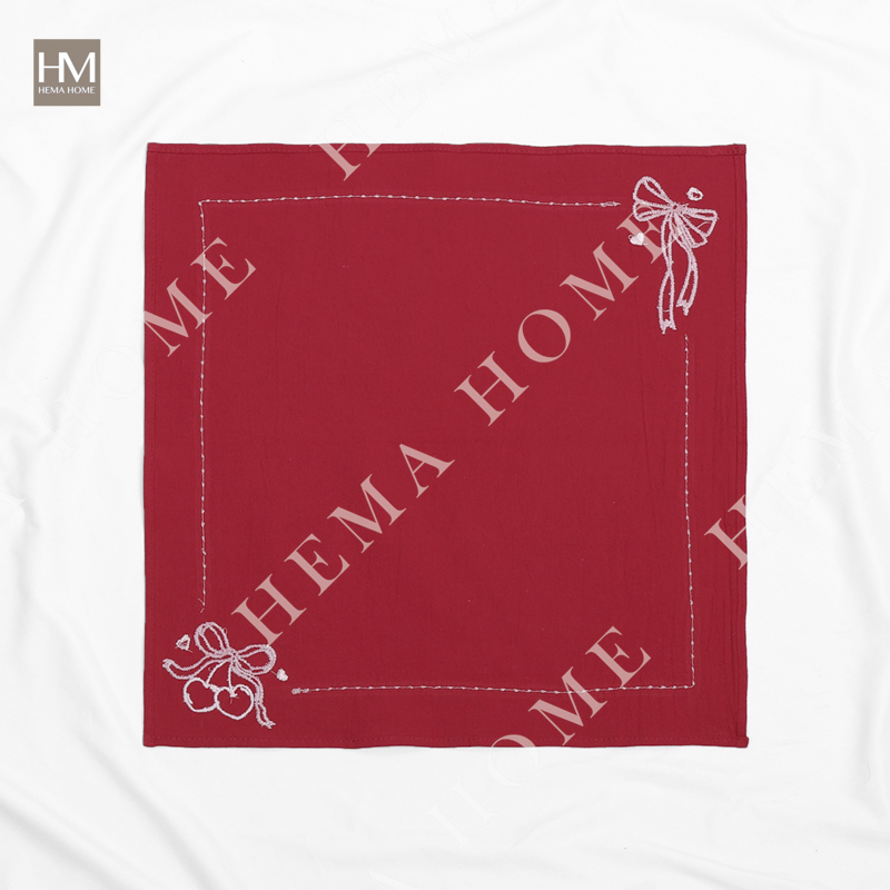 Embroidered cotton napkin with cherry/rose/bowknot pattern, with 0.5cm hemming.