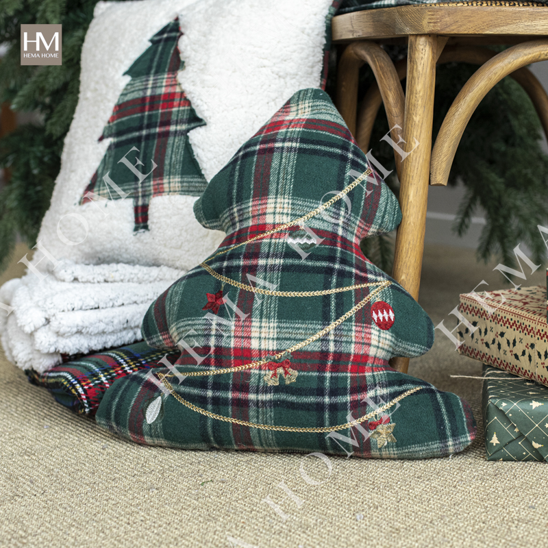 Both sides are checked fabric in christmas tree shape, one side with embroidered chritmas tree pattern.
