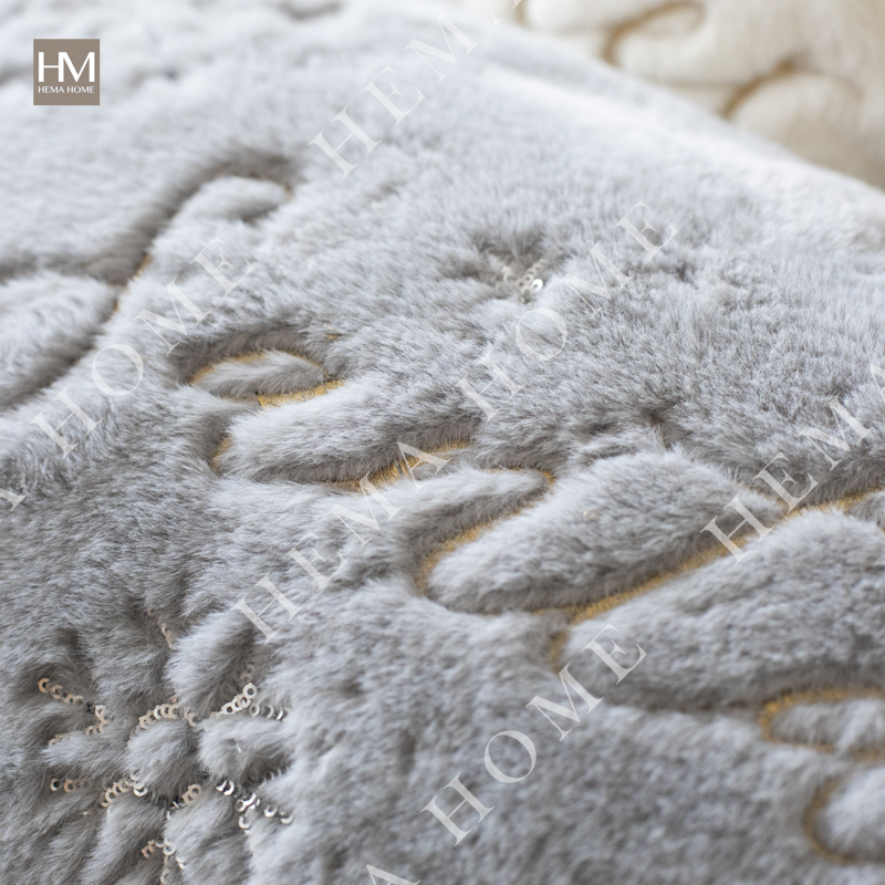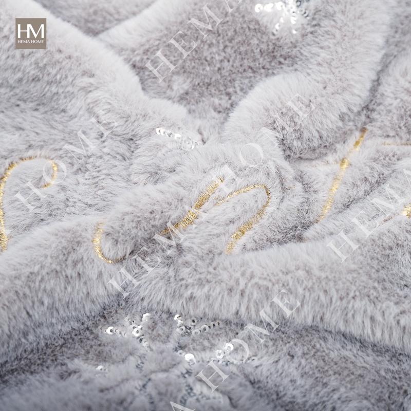 Front side is 550GSM rabbit fur fabric with santa letter embroidery and sequin embroidery ,back side is solid 220GSM velvet fabric.