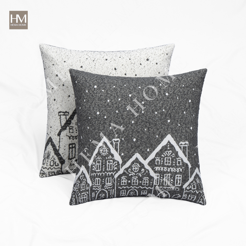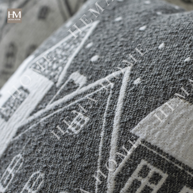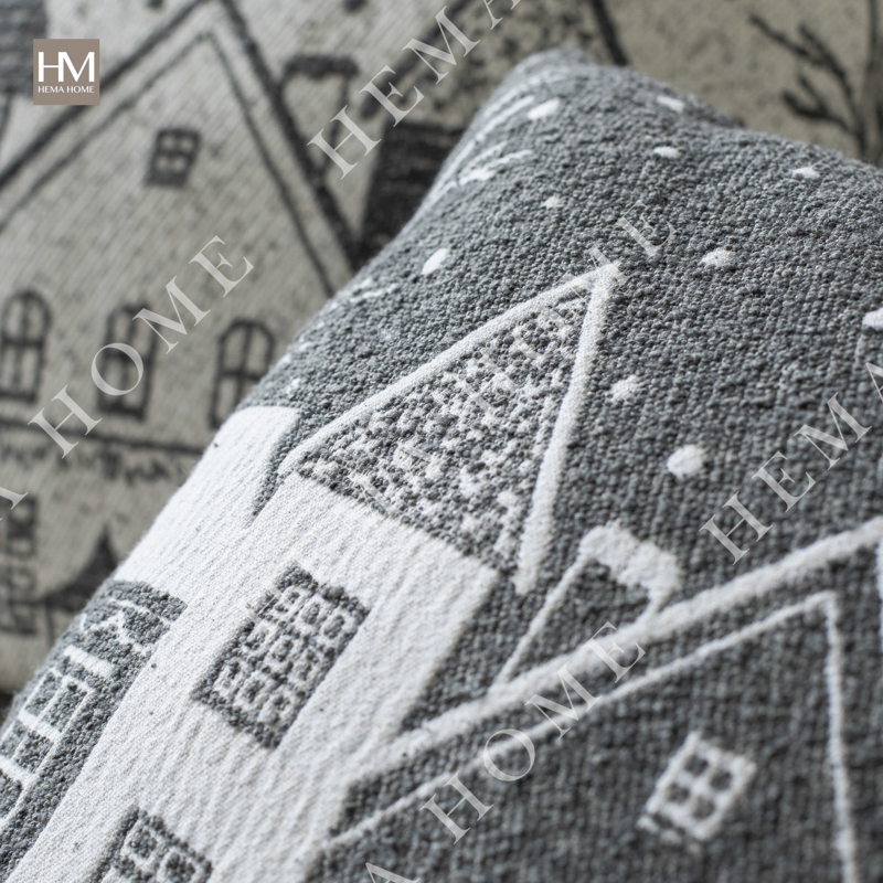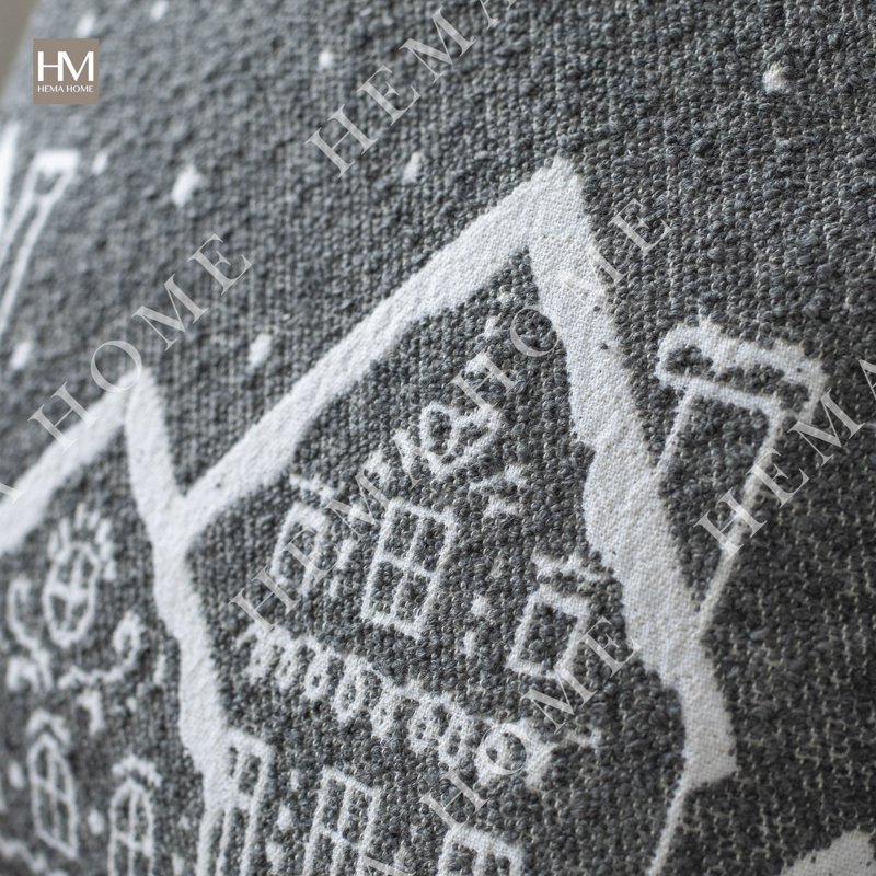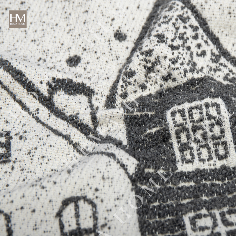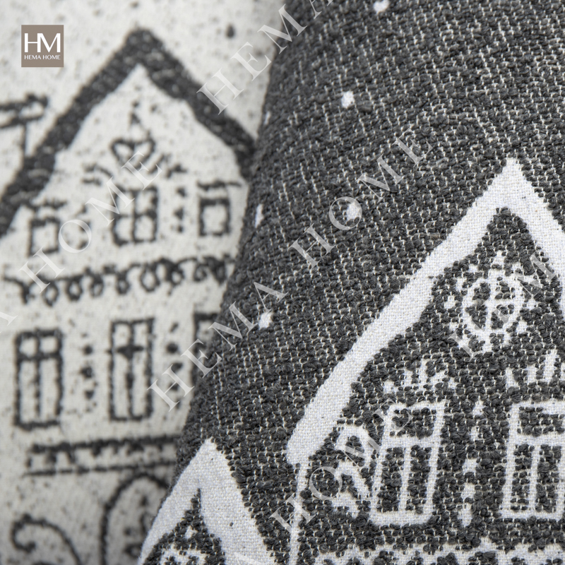 Front side is jacquard house pattern 400GSM polyester fabric, back side is solid 200GSM cotton fabric.