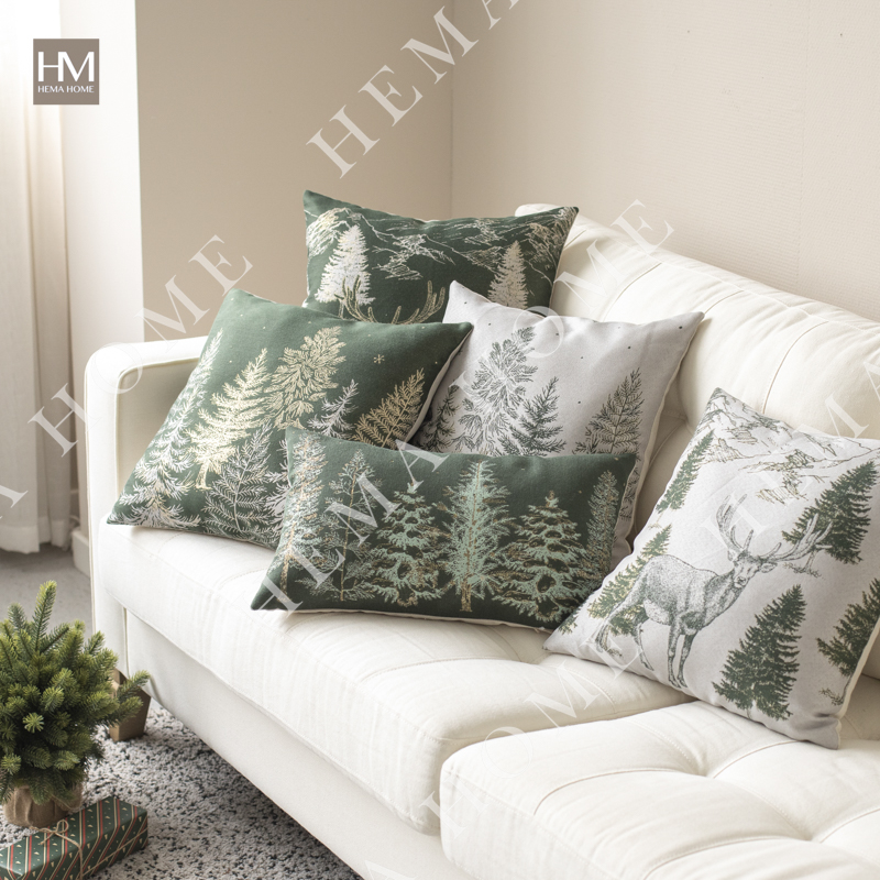 Front side is jacquard Xmas tree pattern fabric, back side is solid poly-cotton fabric, with zipper, with filling.