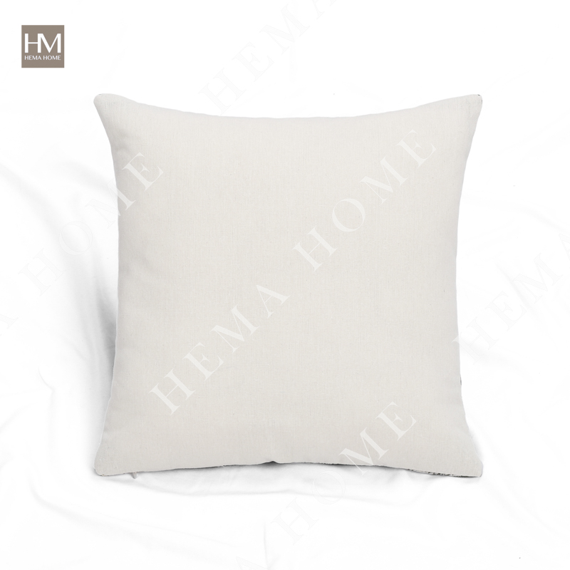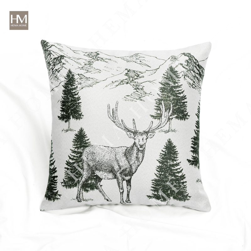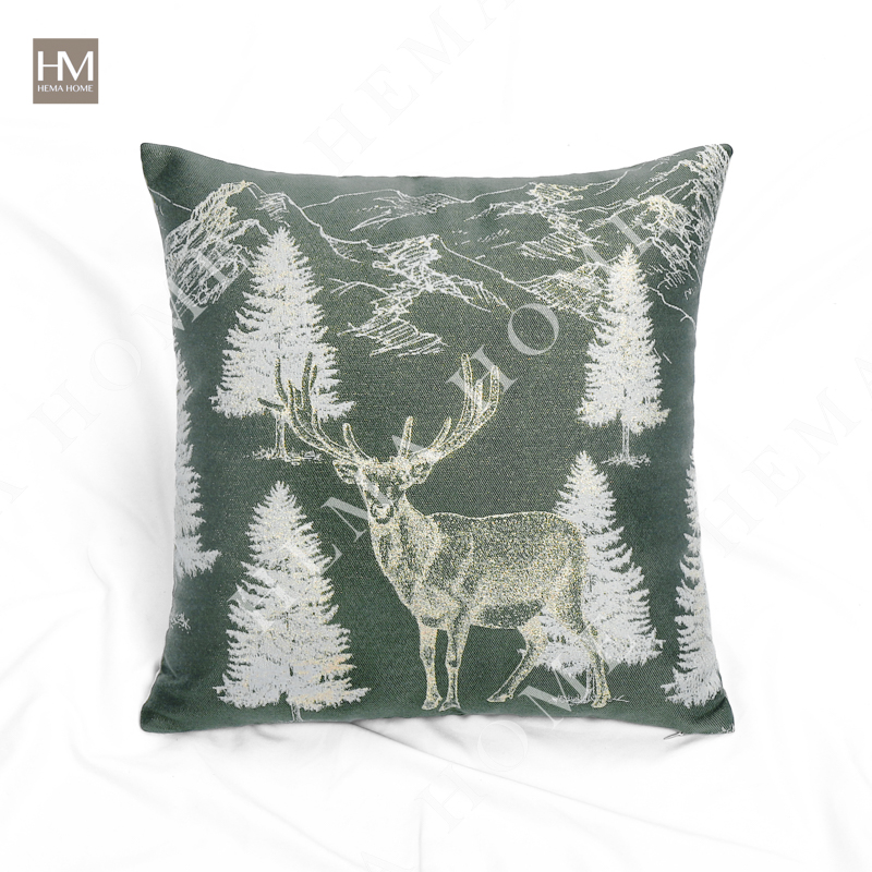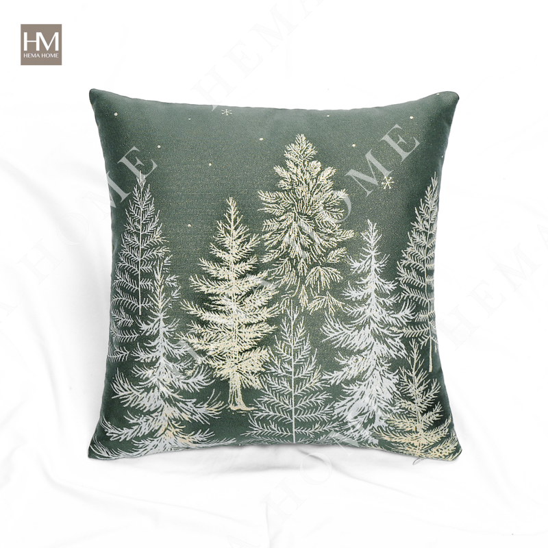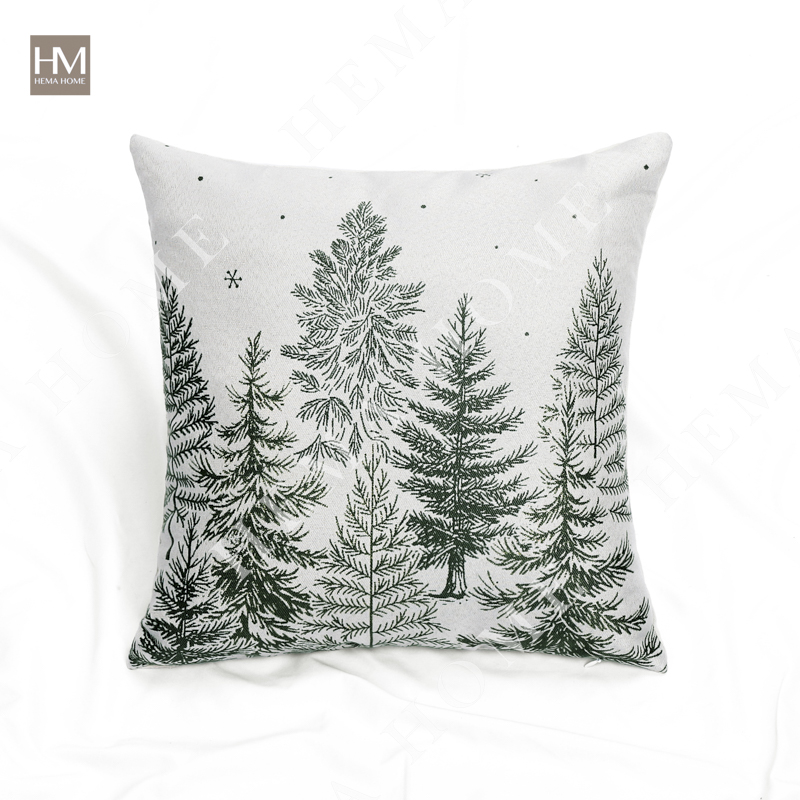 Front side is jacquard Xmas tree pattern fabric, back side is solid poly-cotton fabric, with zipper, with filling.