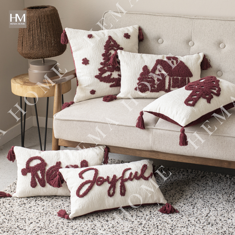 Loop Embroidered Christmas Elements Chenille Fabric Cushion with Tassel