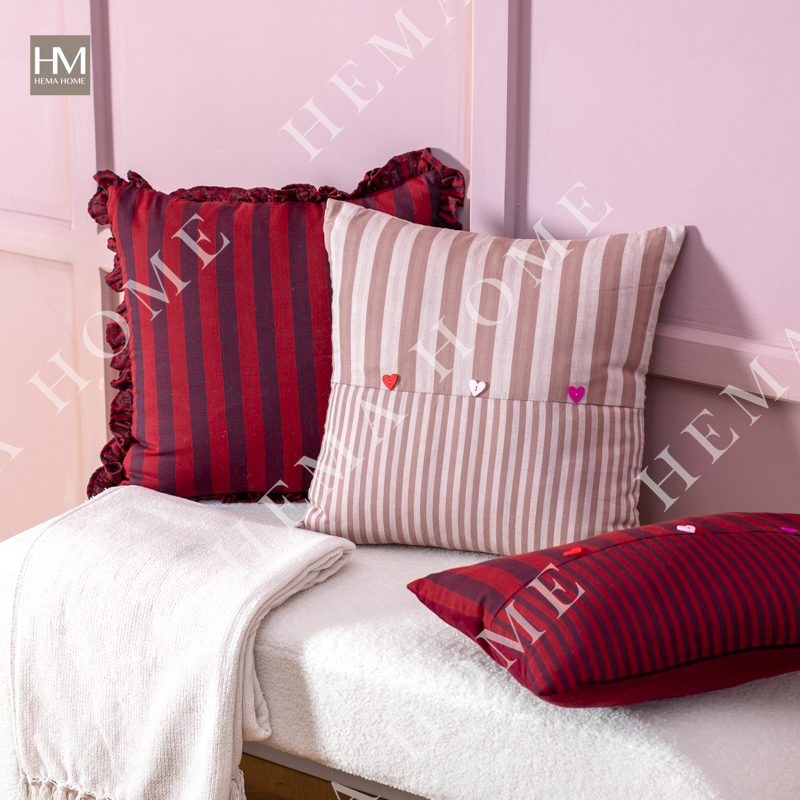 Patchwork Stripe Pattern Cotton Cushion with Heart Shape Wooden Buttons