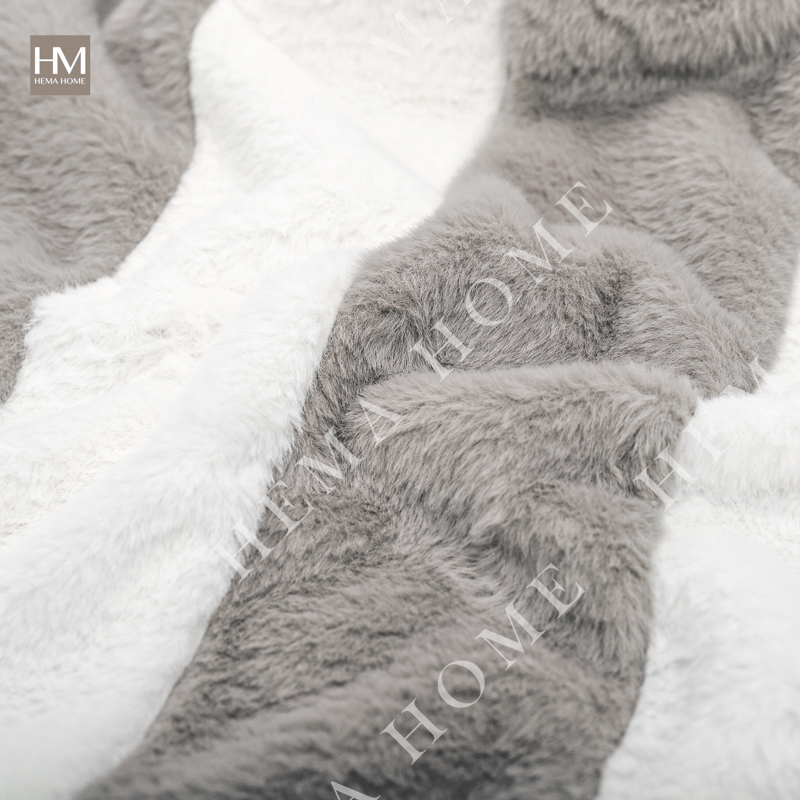 Front side is rabbit fur fabric with stripe/rectangular patchworked , back side is velvet fabric in solid color.