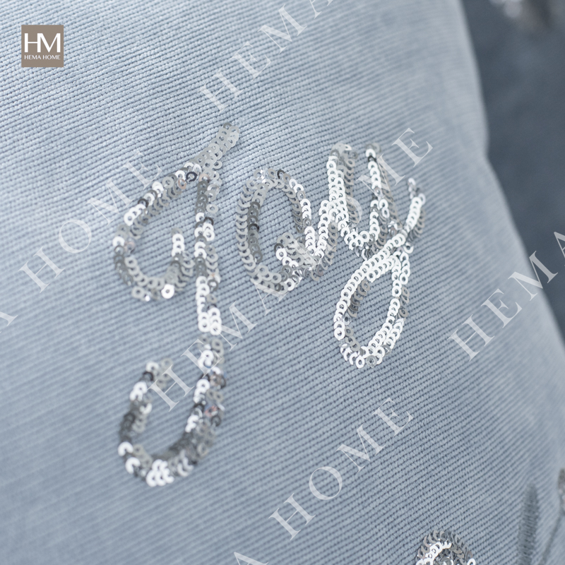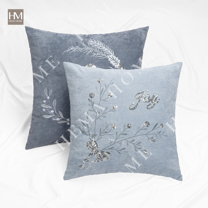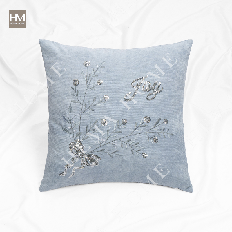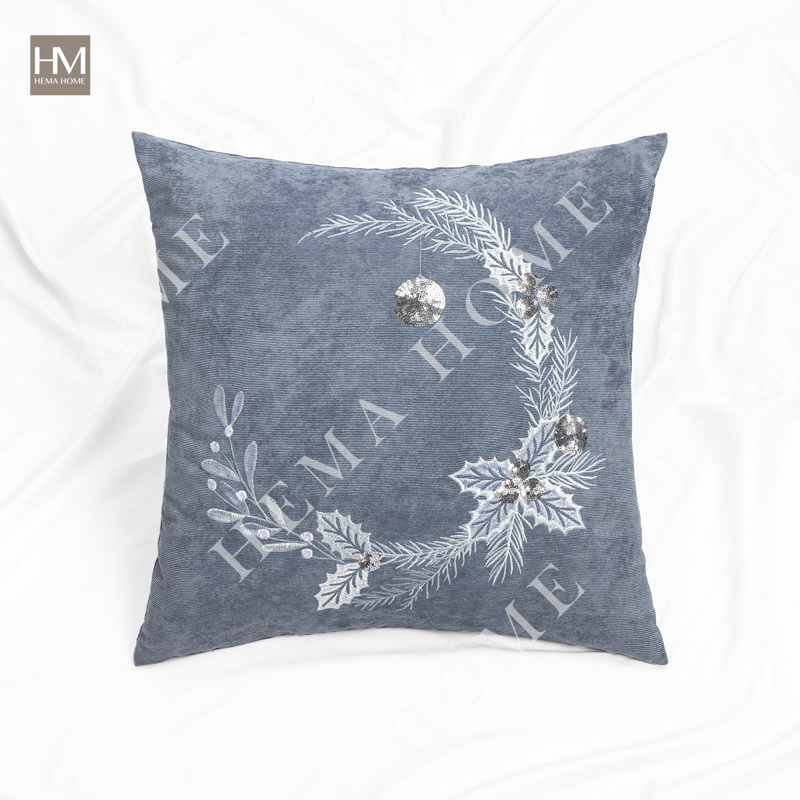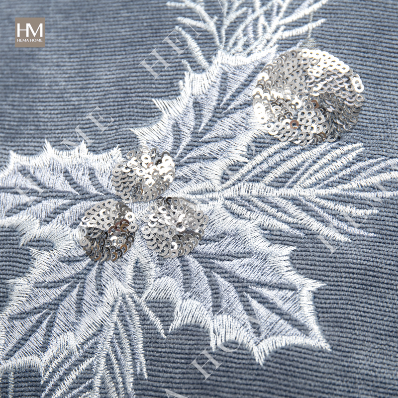 Sequin Embroidery Holly and Joy Words/Pine Leaves and Berries Patterns Corduroy Fabric Cushion